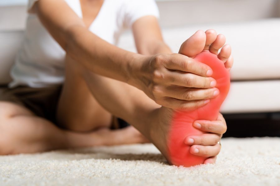 典型的な初期症状: 朝起きて最初の一歩目に、かかとに鋭い痛みが走る。